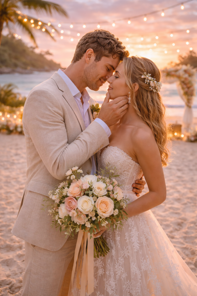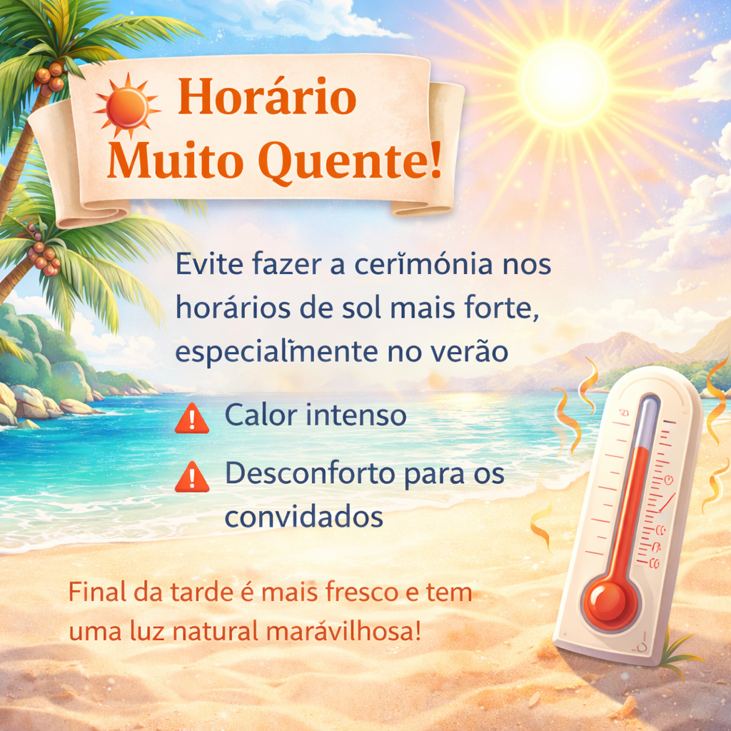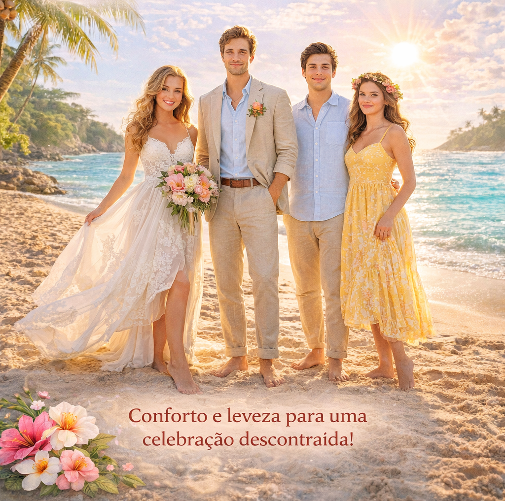 Uma cerimônia romântica, leve e com um cenário naturalmente deslumbrante, ao som das ondas, o pôr do sol dourado e a brisa do mar criam uma atmosfera única, perfeita para celebrar o amor de forma especial e inesquecível.