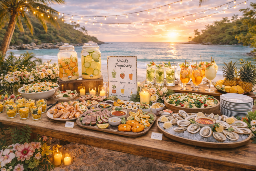 O cardápio deve ser leve e refrescante. Além disso, bebidas tropicais combinam perfeitamente com o clima da praia. Dessa maneira, os convidados aproveitam a festa com mais conforto: